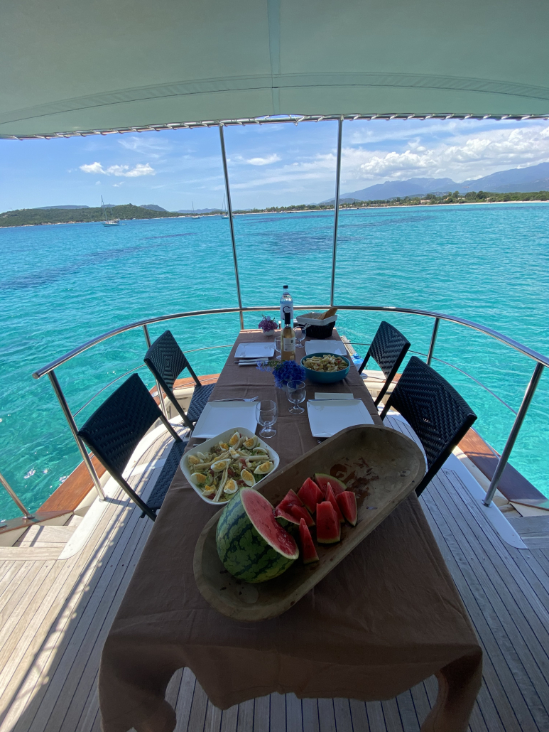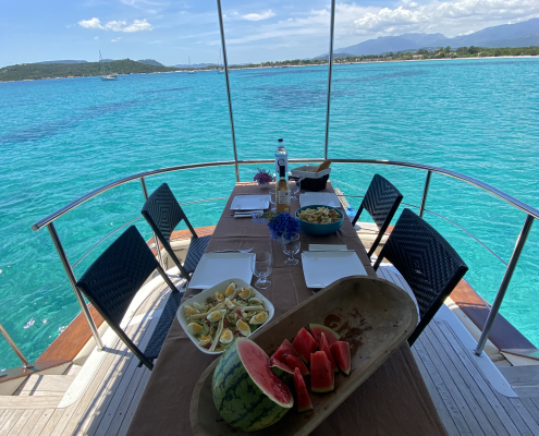 Afin de profiter au maximum de votre séjour à bord, le « Caloa » est disponible pour une nuit au mouillage sur une zone de navigation entre San Ciprianu et Pinarello.